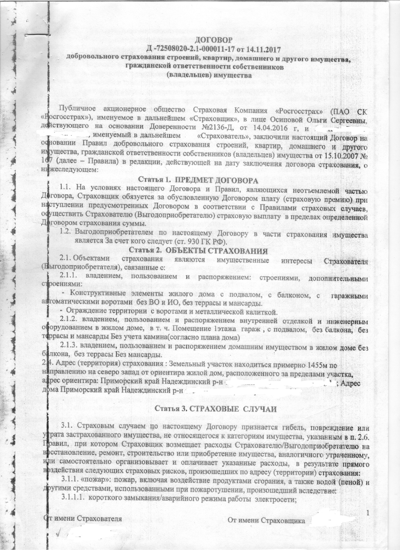 Итак, в ноябре 2017 года счастливый обладатель чудесного загородного дома в Надеждинском районе замечательного нашего Приморского края заключает договор, согласно которому страховщик - Росгосстрах, - обязан выплатить страховую выплату при наступлении страхового случая.