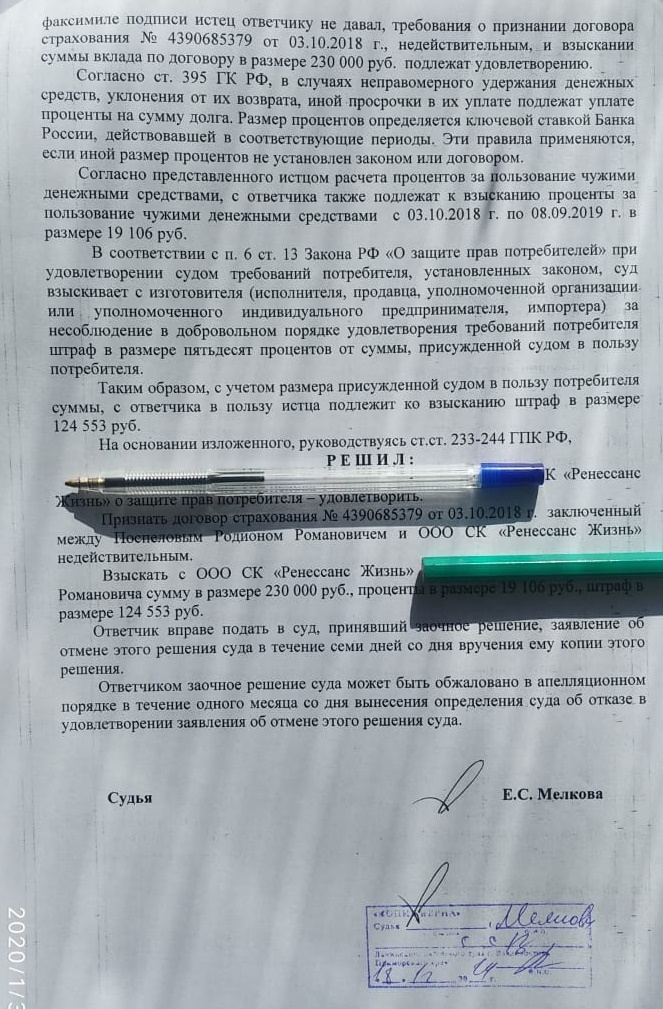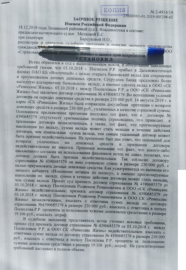 Что делает наш герой? Он находит юриста, который идет в суд и оспаривает заключенный договор страхования.