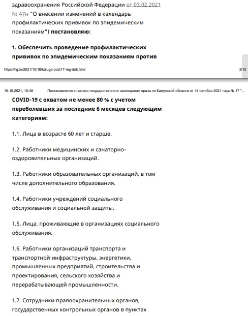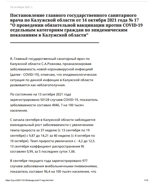 Вот напрмиер, свежеиспеченное Постановление главного государственного санитарного врача по Калужской области от 14 октября 2021 года № 17 "О проведении обязательной вакцинации против COVID-19 отдельным категориям граждан по эпидемическим показаниям в Калужской области"