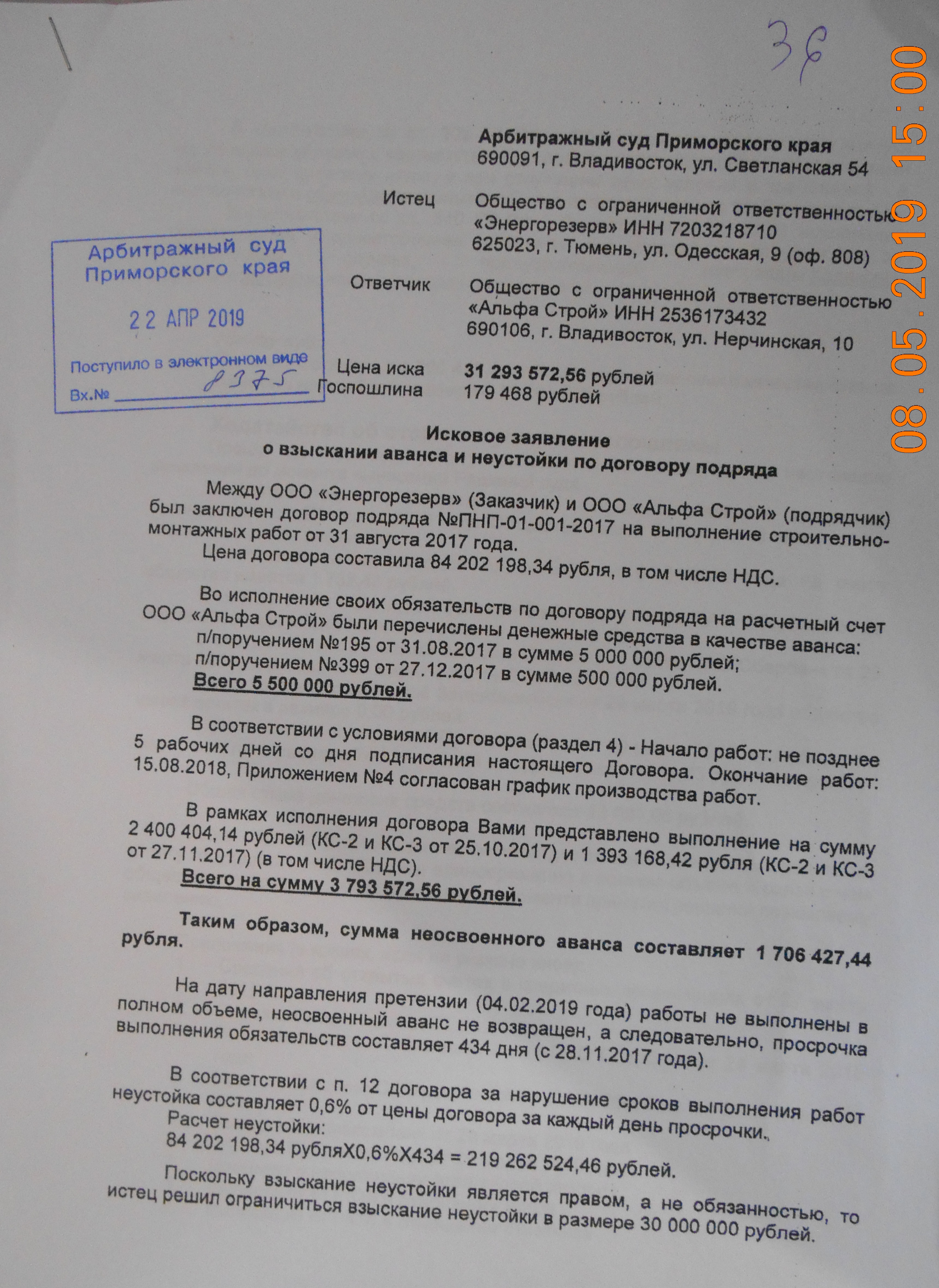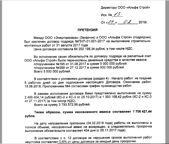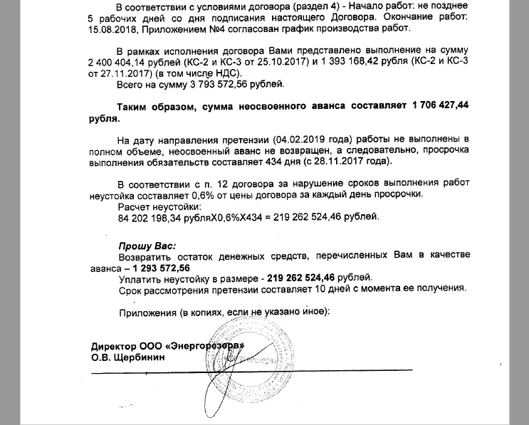 Однако через полтора года Ваше предприятие получает досудебную претензию, где заказчик просит Вас вернуть неотработанный аванс и выплатить шрафную неустойку за нарушение срока выполнения работ в размере около 30 миллионов рублей...